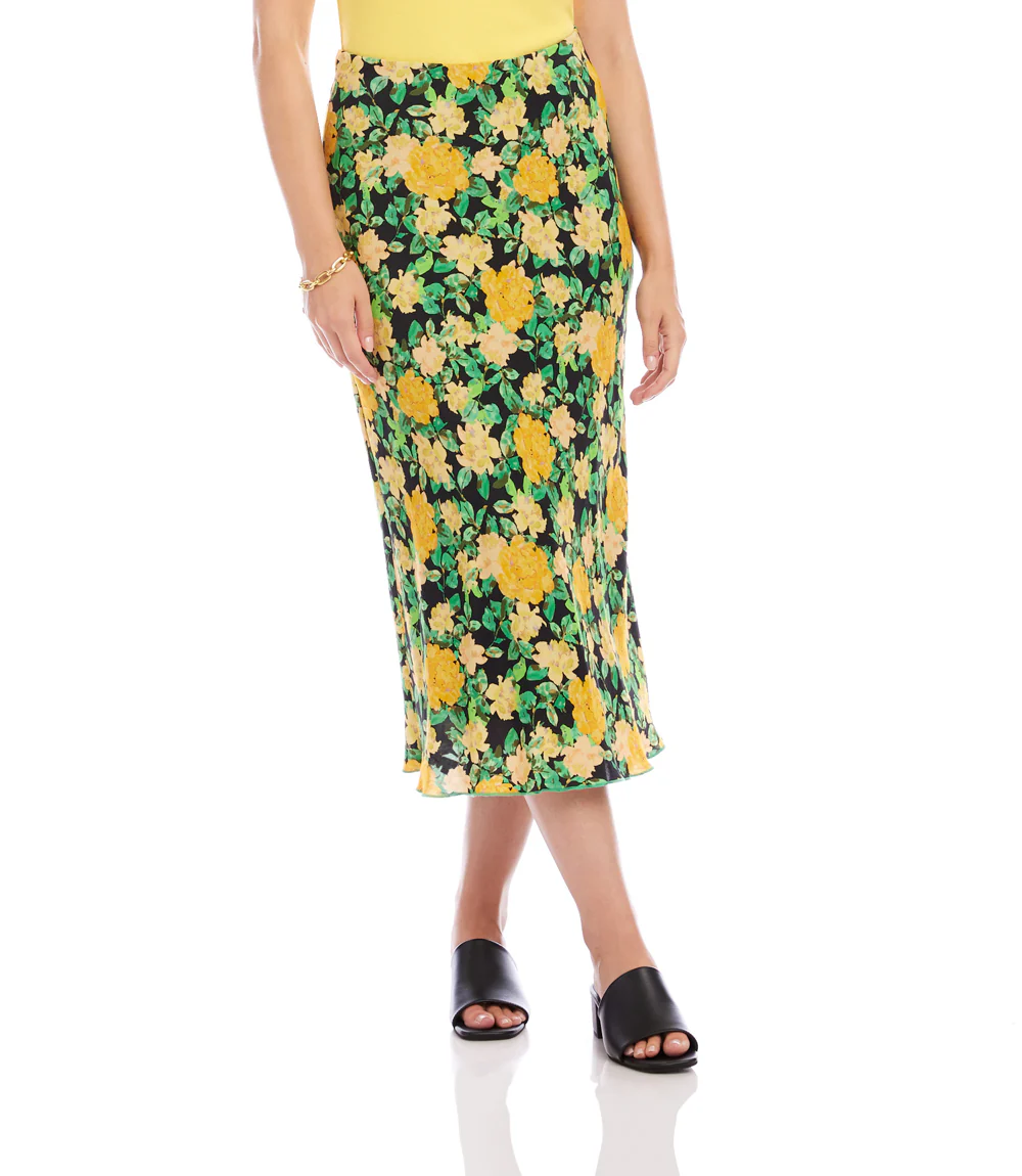 This bias-cut midi skirt drapes beautifully with its fluid silhouette, featuring an easy elastic waistband and a vibrant golden rose print for an effortlessly elegant look.